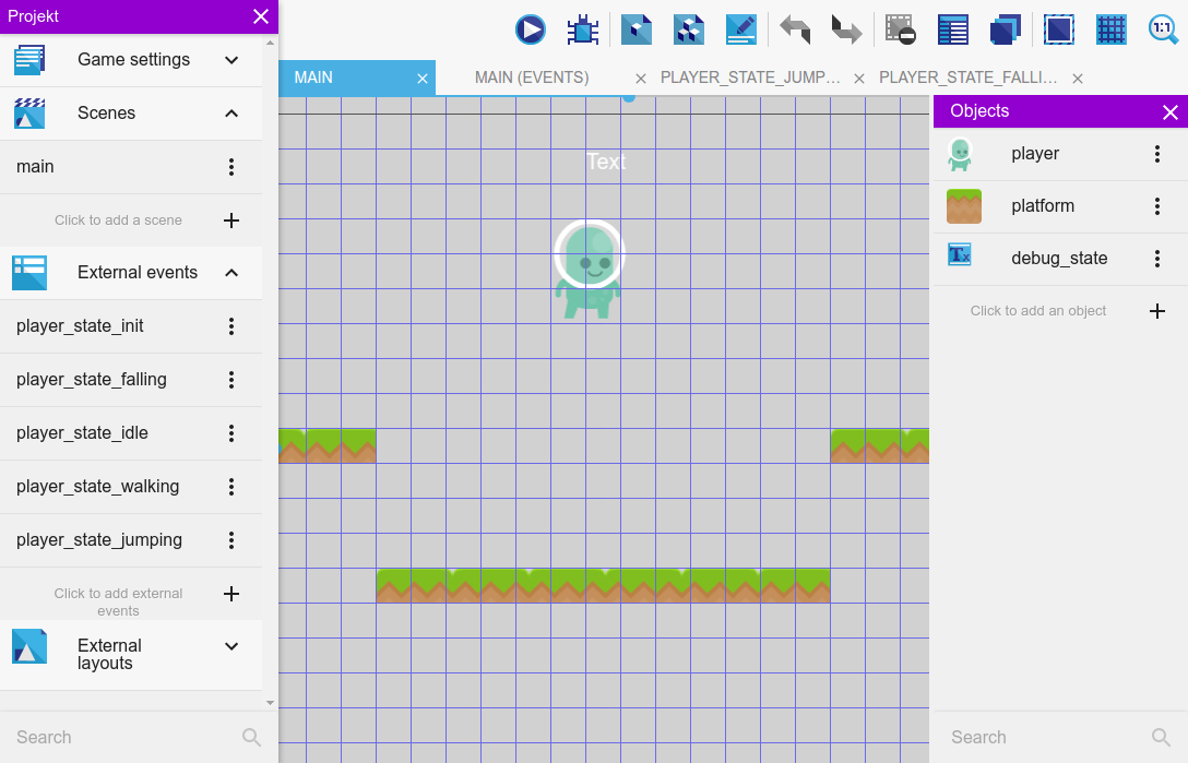 So let's get started by downloading the assets from the “” tutorial. Create a player as a “platformer object” and some platforms (“platform” behavior) to walk and jump on as described in the above-mentioned tutorial.